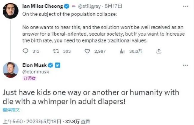 據(jù)財(cái)聯(lián)社報(bào)道,馬斯克近兩年頻繁就全球人口減少的問題多次發(fā)出警告,日前他又再度“催生”。馬斯克在一則推文中強(qiáng)調(diào)在出生率下降的情況下迫切需要采取行動,以及若不作為,人類未來所面臨的潛在后果。#馬斯克再敲人口警鐘#